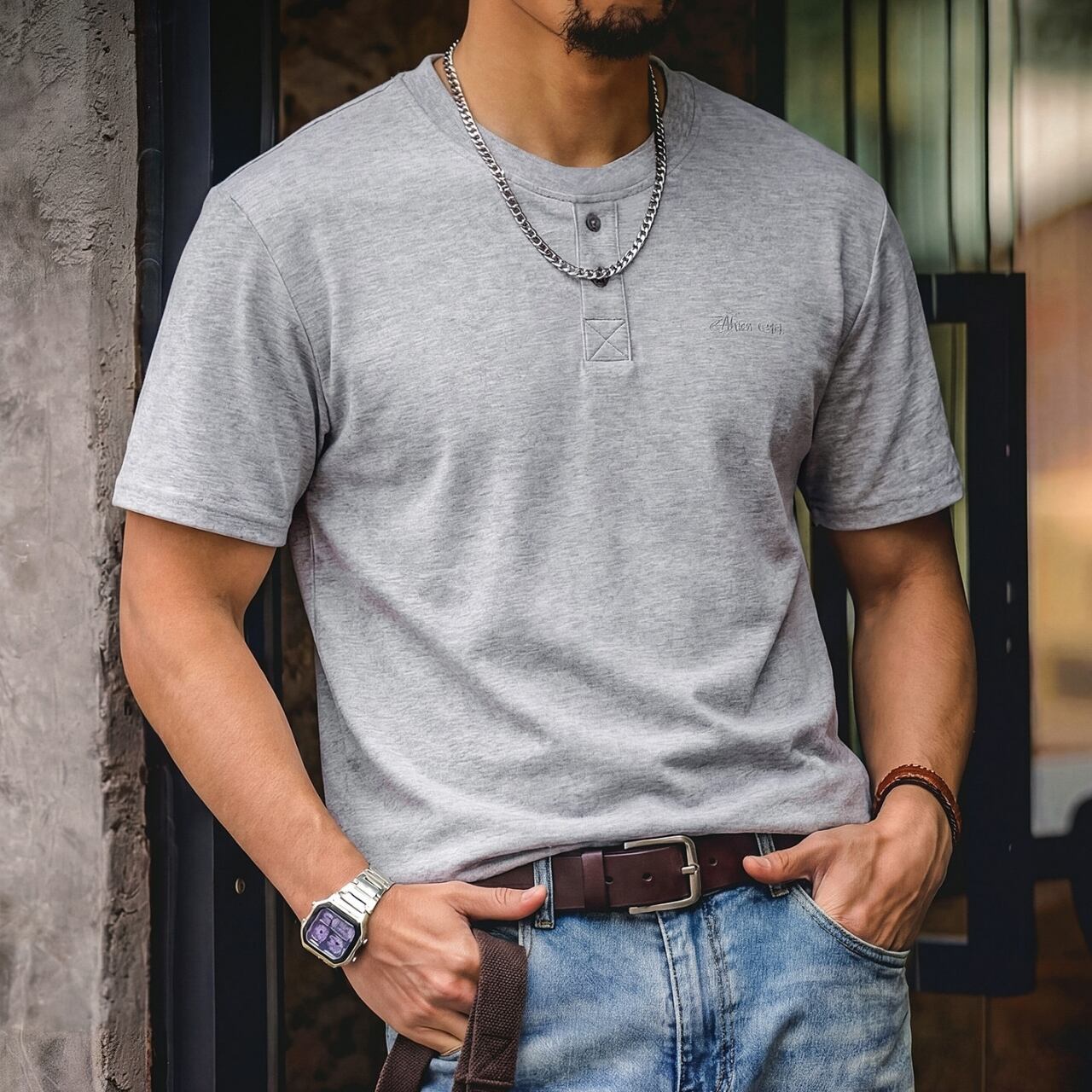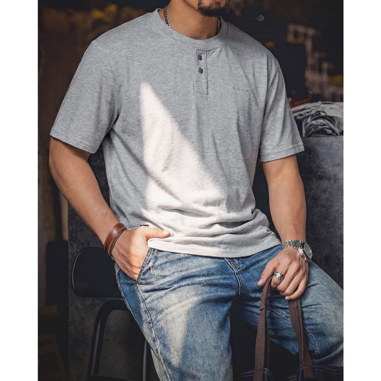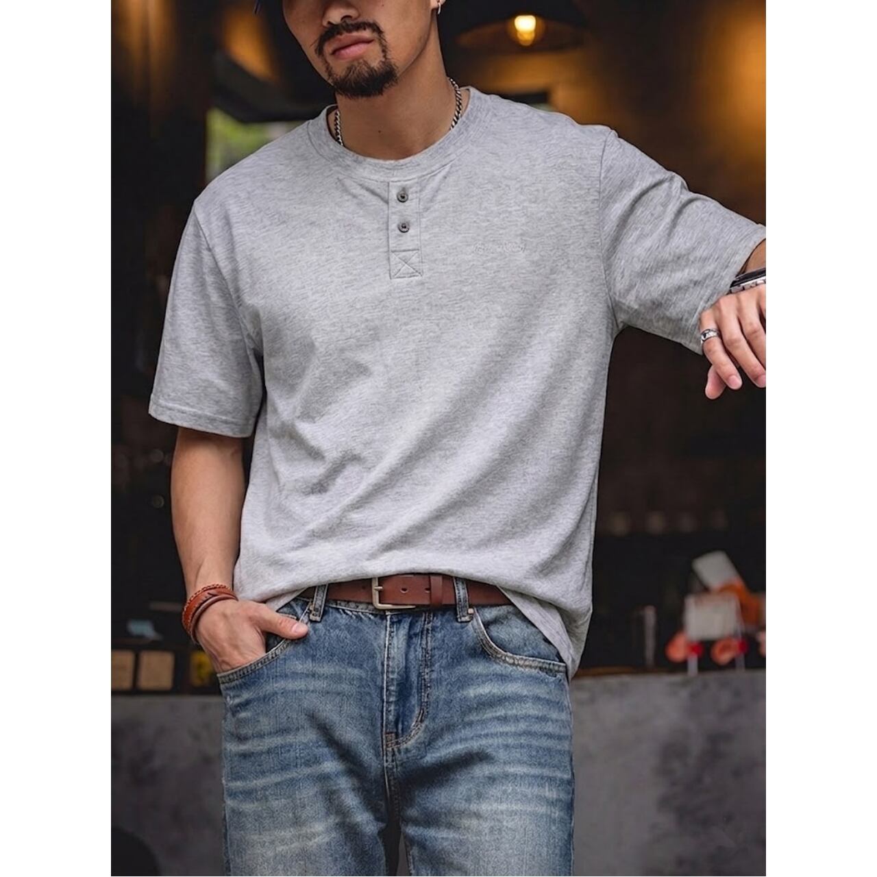 首元のボタンがアクセントになった、ヘンリーネックデザインのTシャツです。