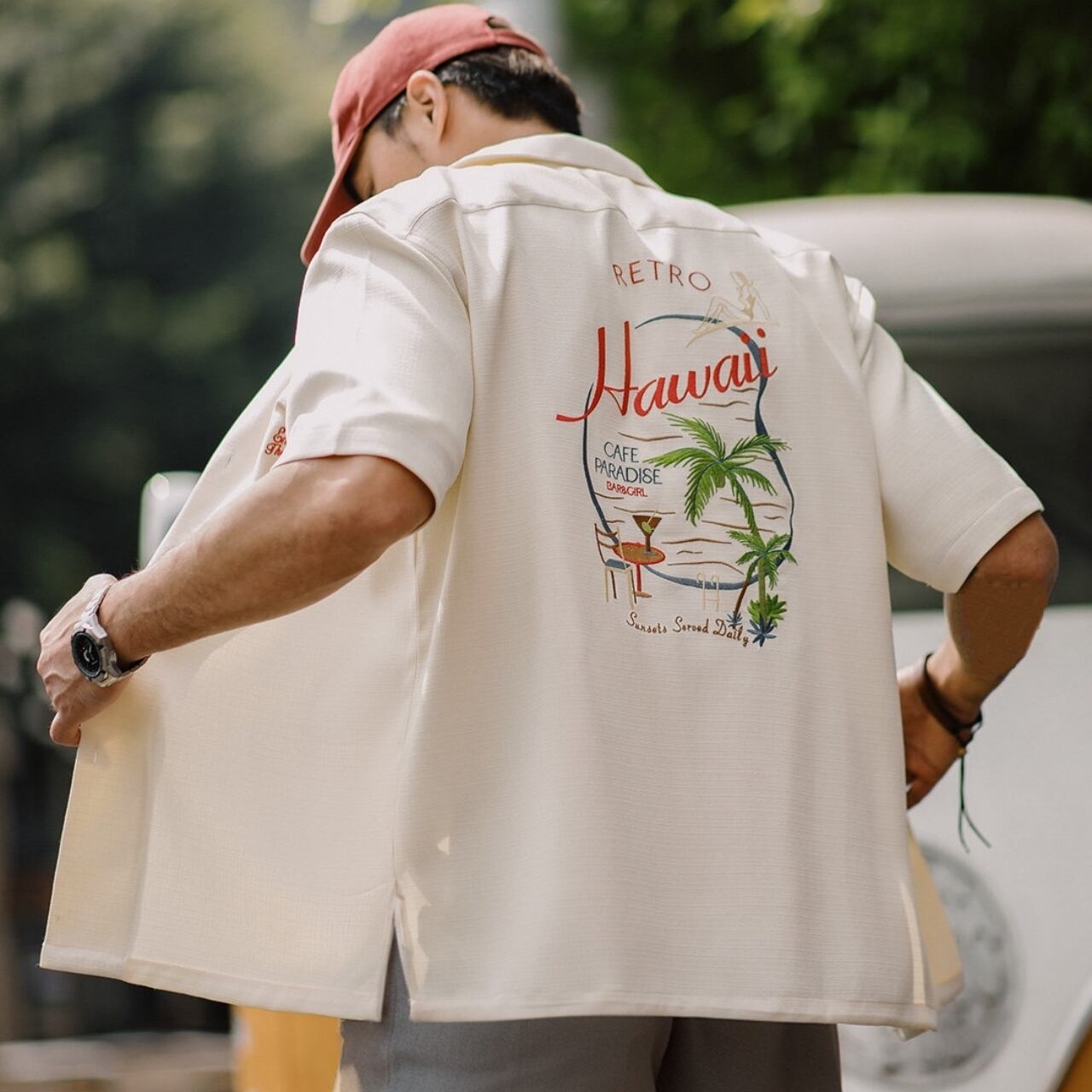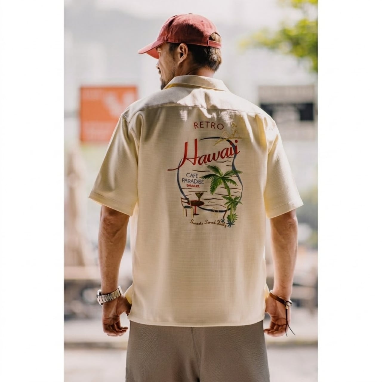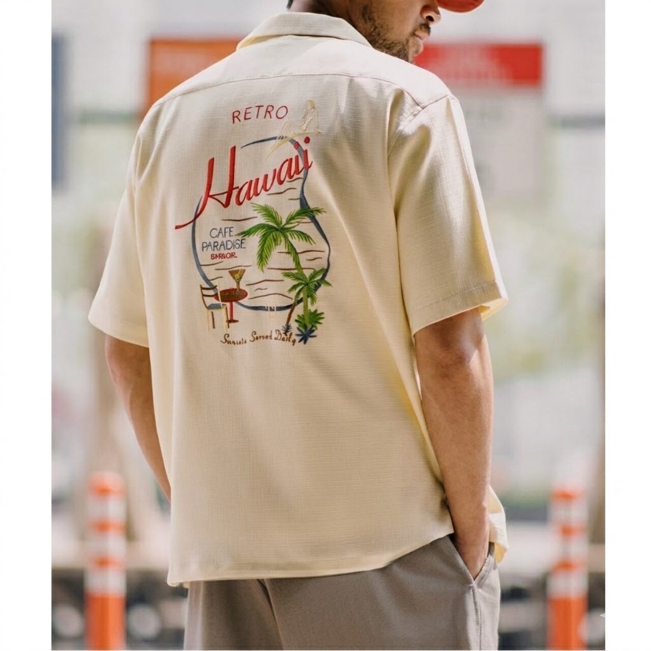 背面に大きく描かれたハワイのグラフィックが目を引くシャツです。